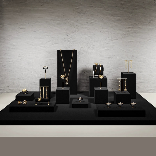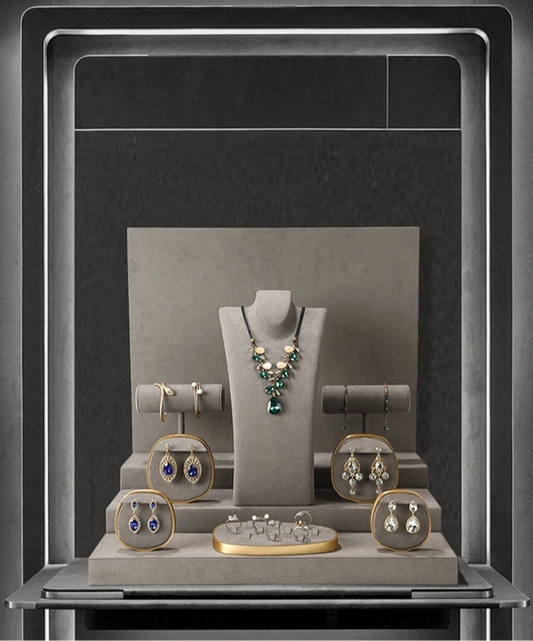 Luxury jewelry window display, props, rings, necklaces, earrings, jade display shelves, ladder jewelry display shelves